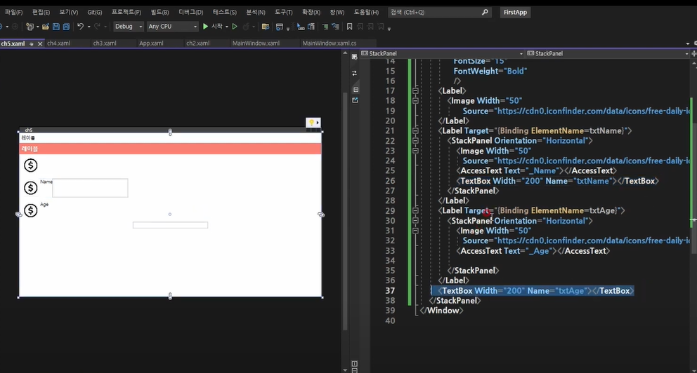 txtName 부분 라벨을 다시 복사하여 txtAge로 이름을 바꾸고 TextBox를 라벨 밖으로 뺀다.