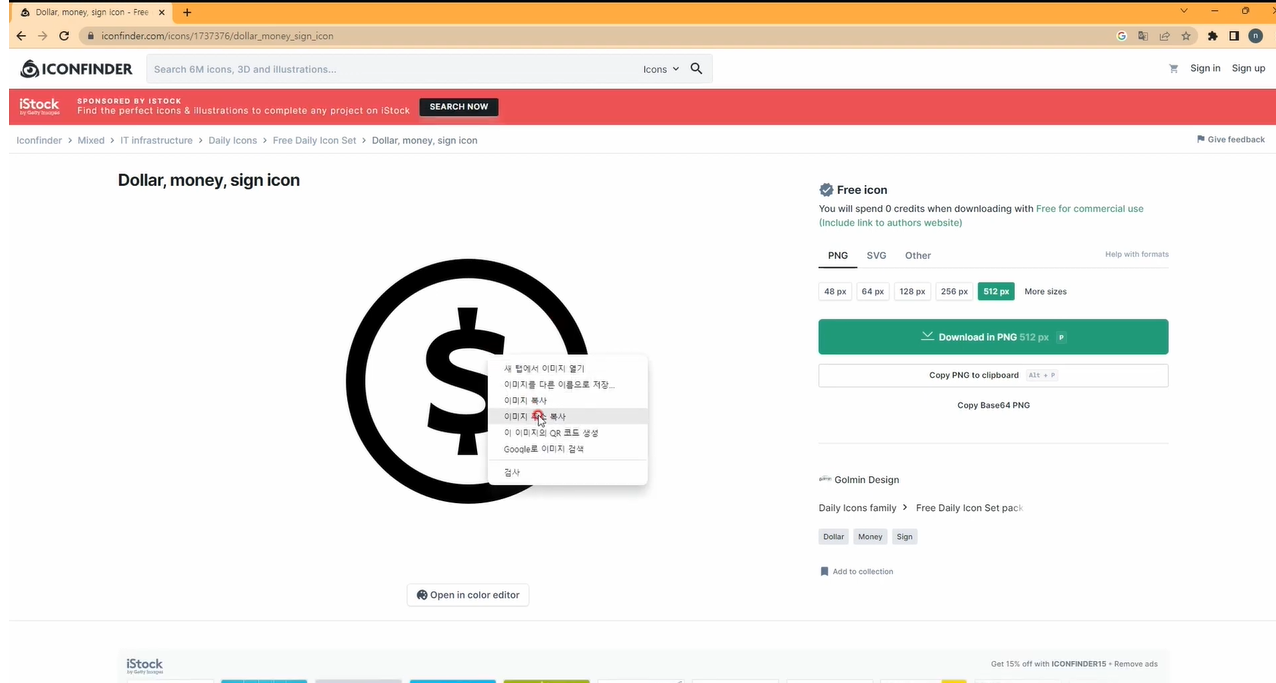 Free로 검색하여 아이콘 들어간 후, 이미지 주소 복사.