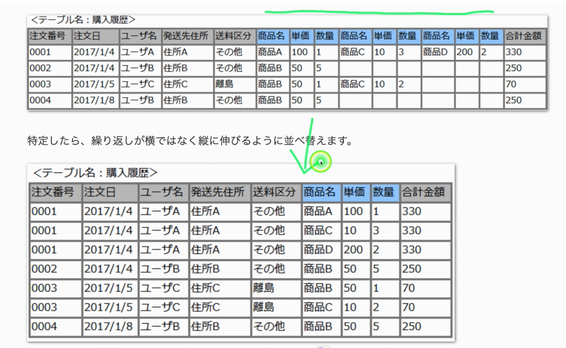 빨간 부분의 상품도 반복되므로 상품 테이블로 분리한다.