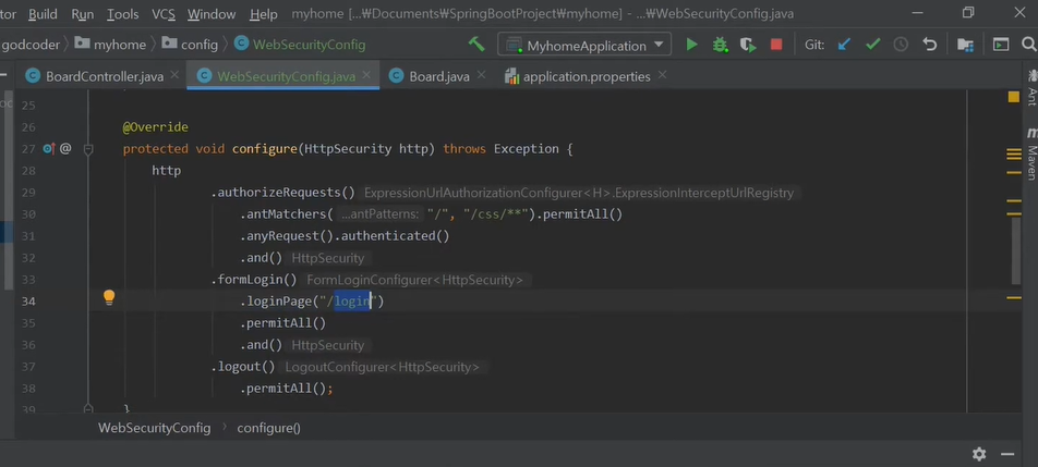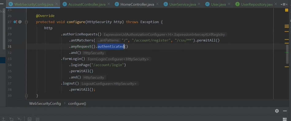 antMatchers의 URL을 제외한 주소는 모두 인증된 유저만 접근할 수 있음.