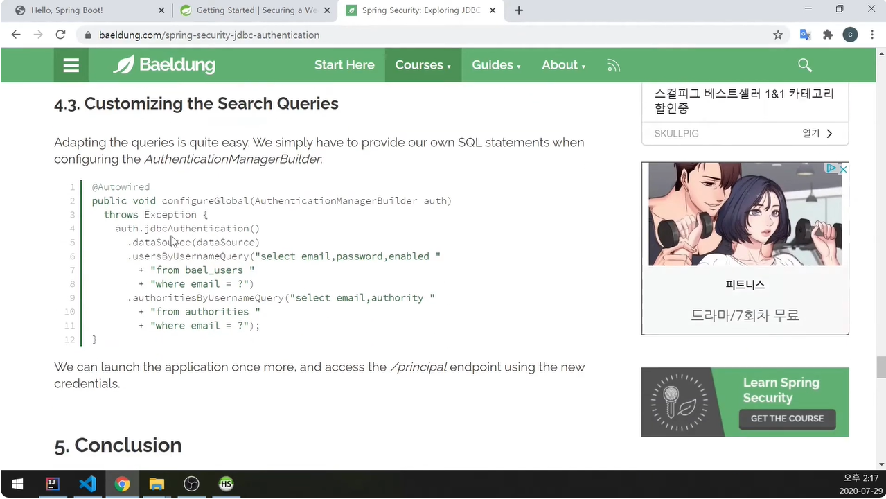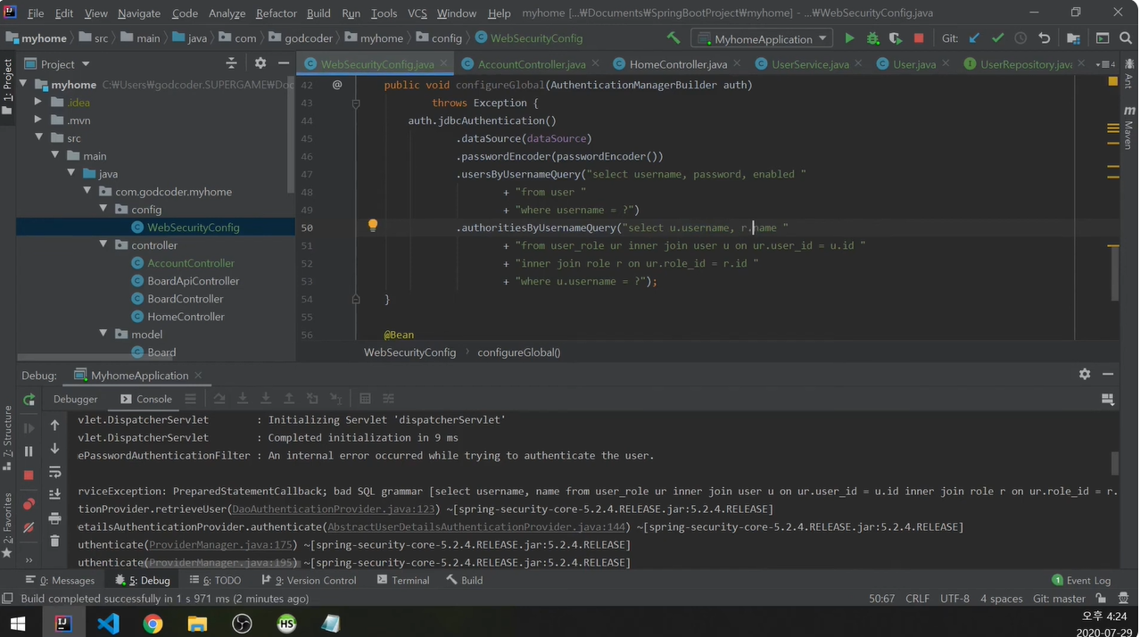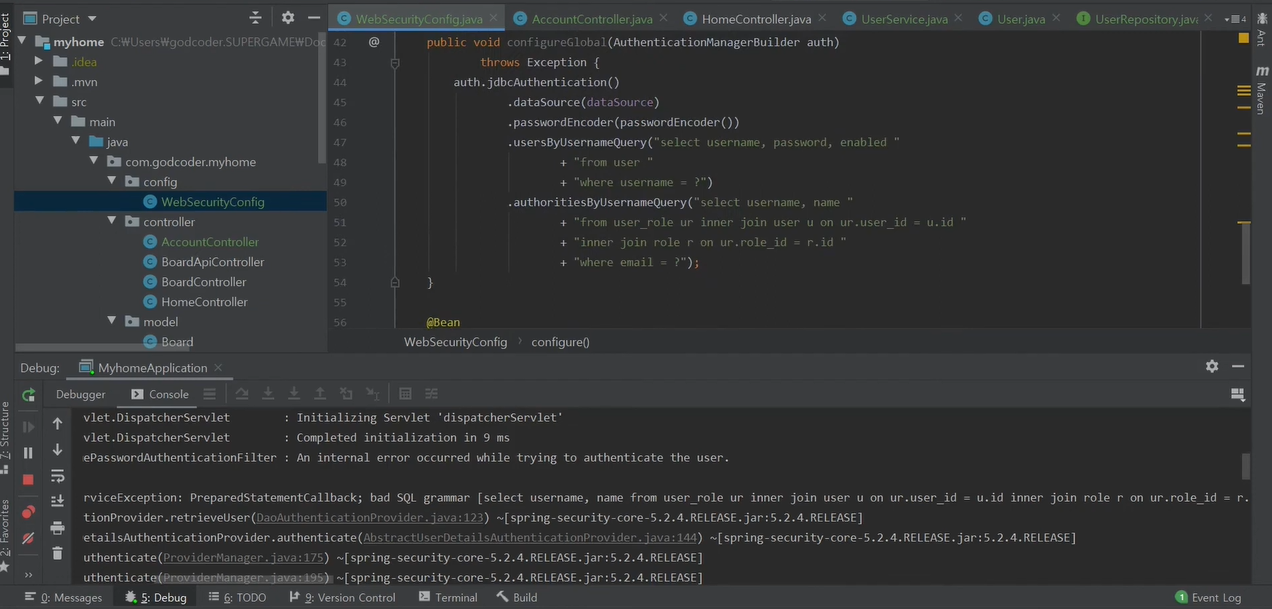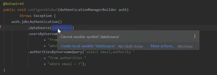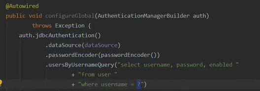 | postgreSQL에서는 user가 예약어이므로 꼼수를 써야 한다. User.java @Table(name = "\"User\"") WebSecurityConfig.java @Autowired public void configureGlobal(AuthenticationManagerBuilder auth) throws Exception { auth.jdbcAuthentication() .dataSource(dataSource) .usersByUsernameQuery("select username, password, enabled " + "from \"user\" " + "where username = ?") .authoritiesByUsernameQuery("select u.username, r.name " + "from user_role ur " + "inner join \"user\" u on ur.user_id = u.id " + "inner join role r on ur.role_id = r.id " + "where u.username = ?"); } |