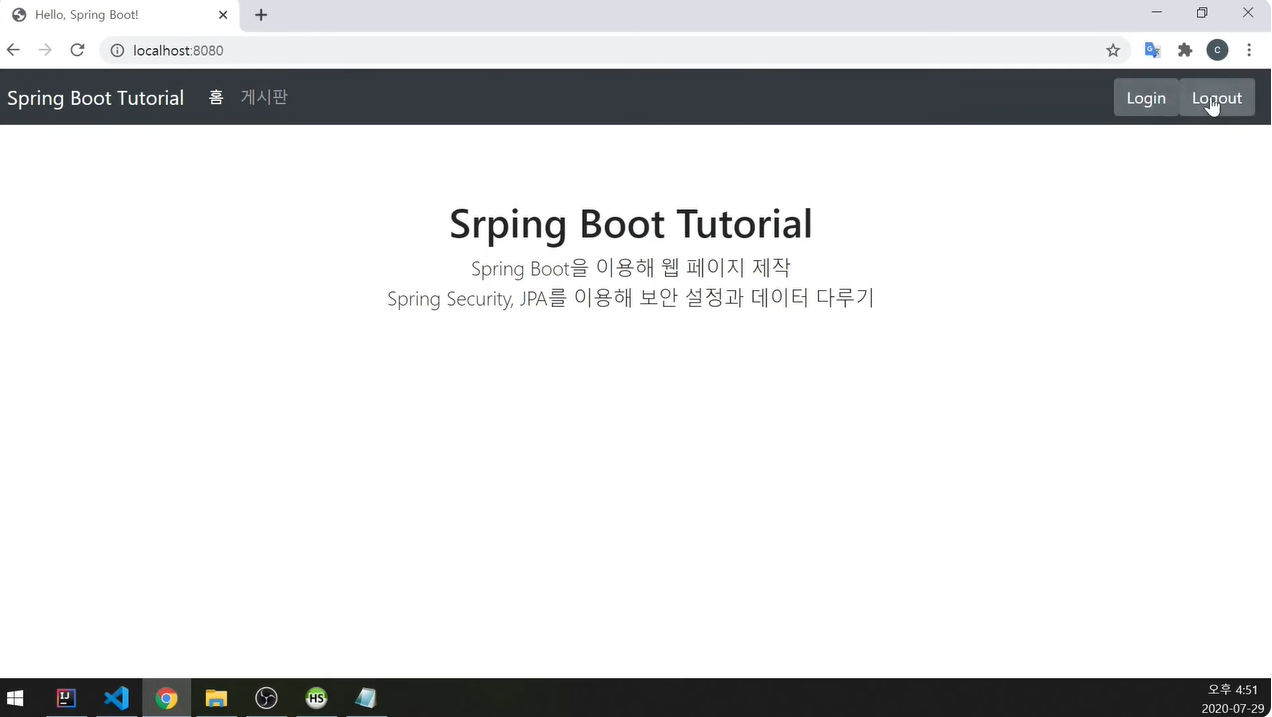 기본적으로 스프링 시큐리티에서 /logout 액션, 메소드는 post로 보내면 로그아웃이 됨.