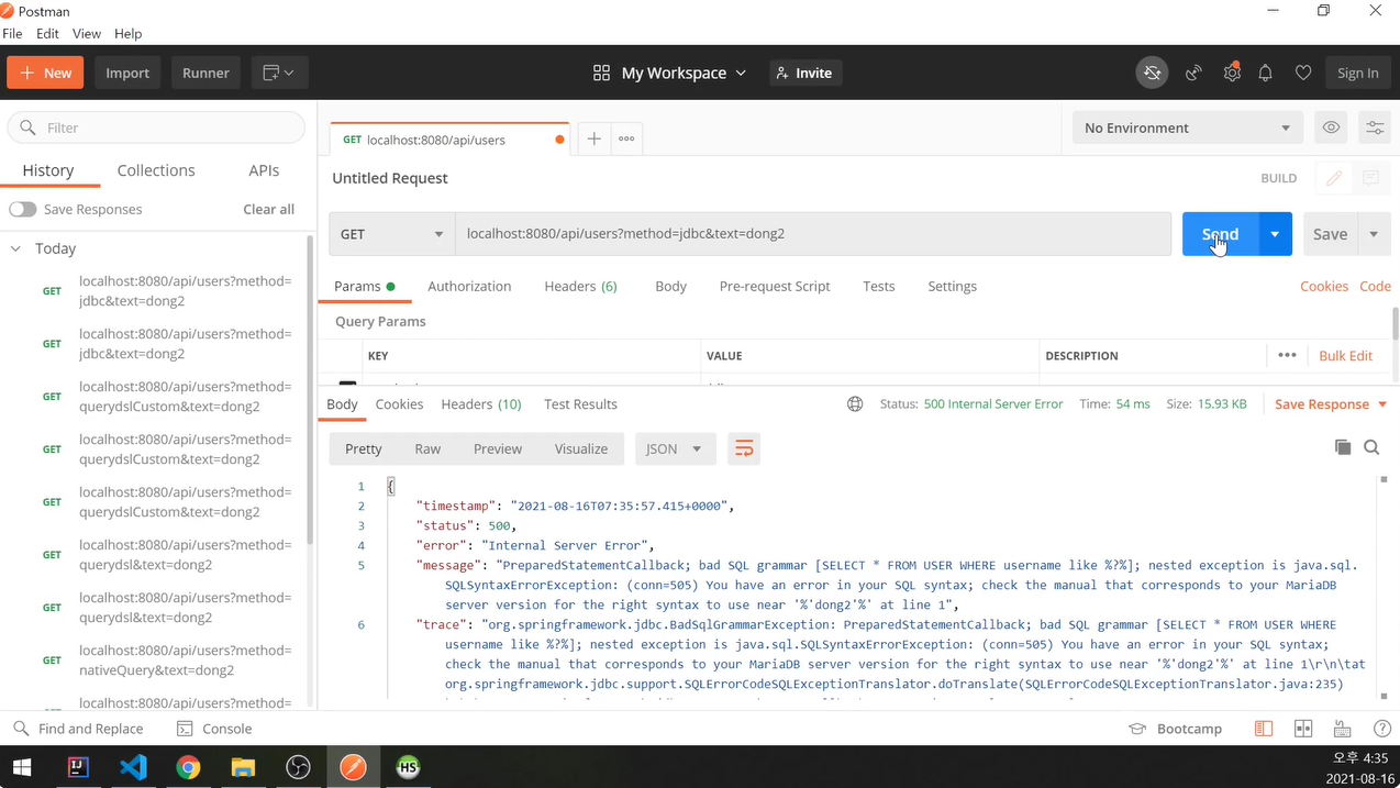 post man에서 native query를 날린다.