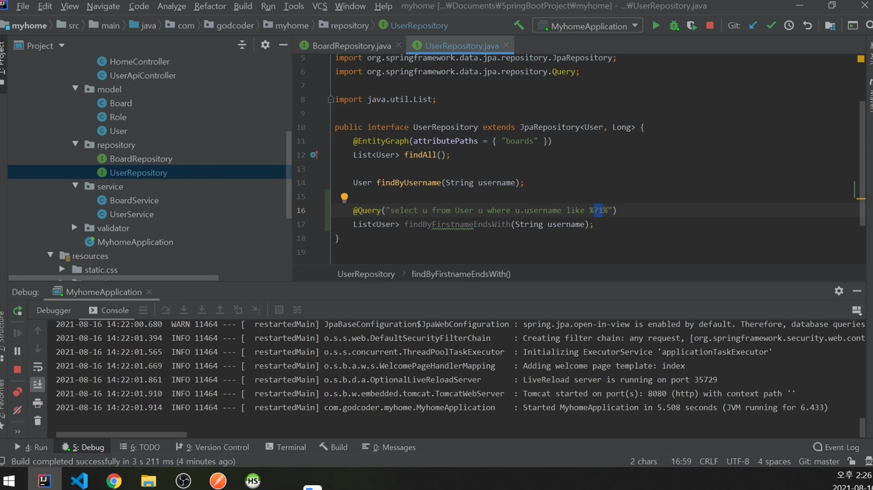 TEXT값을 findByUsernameQuery에 넣어줬음.