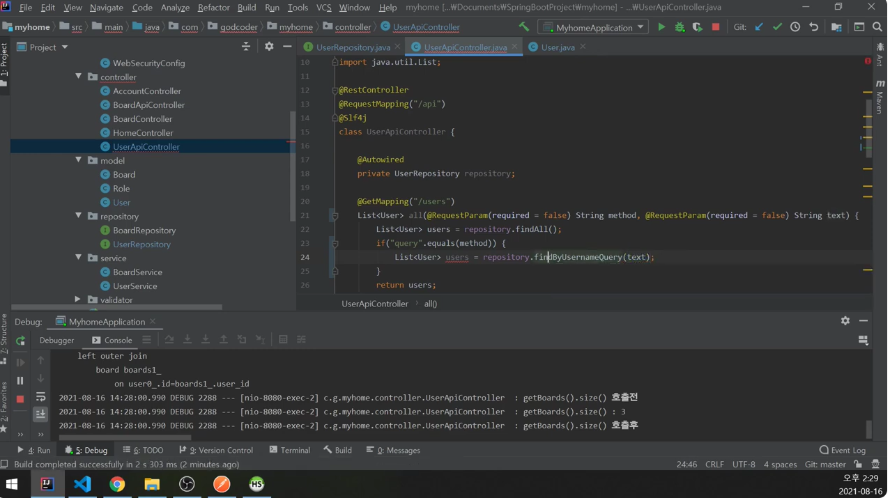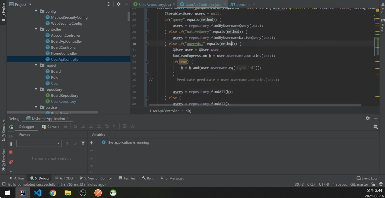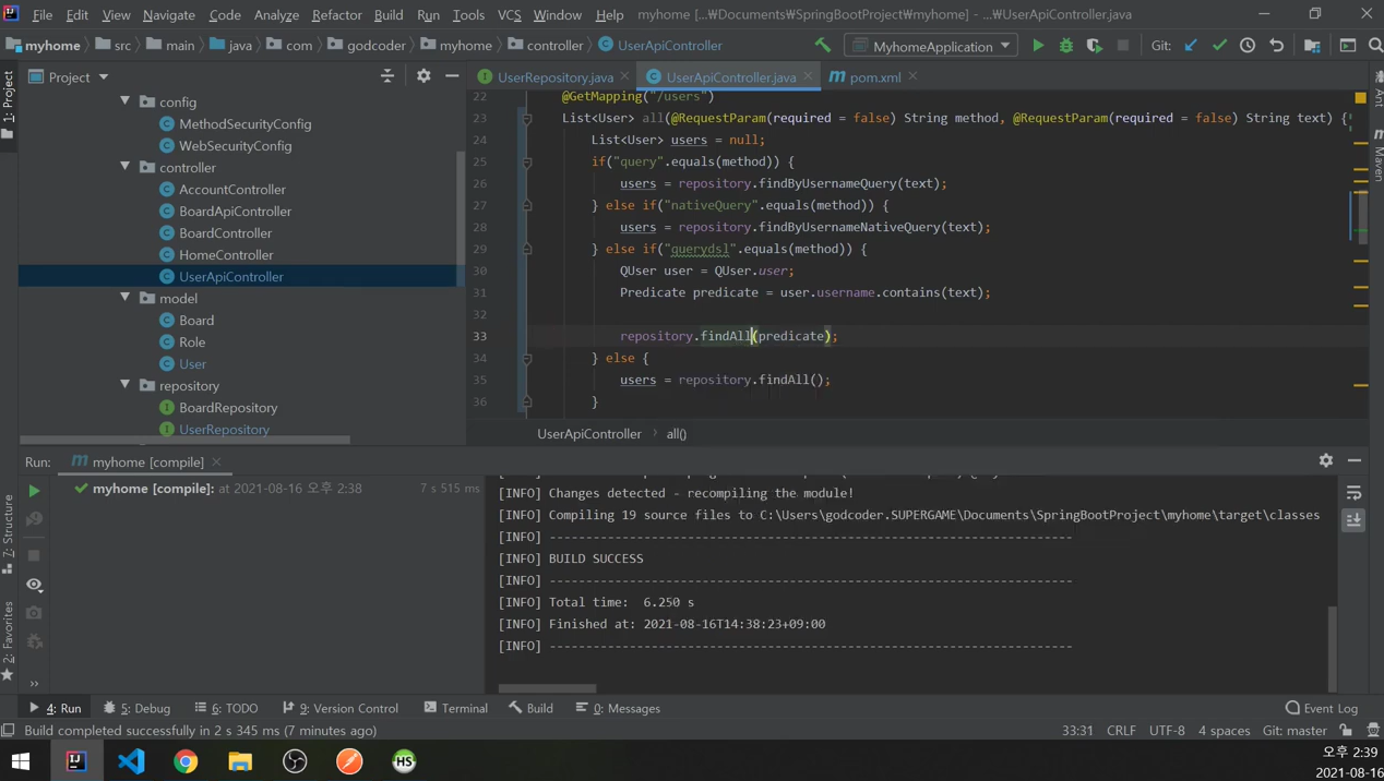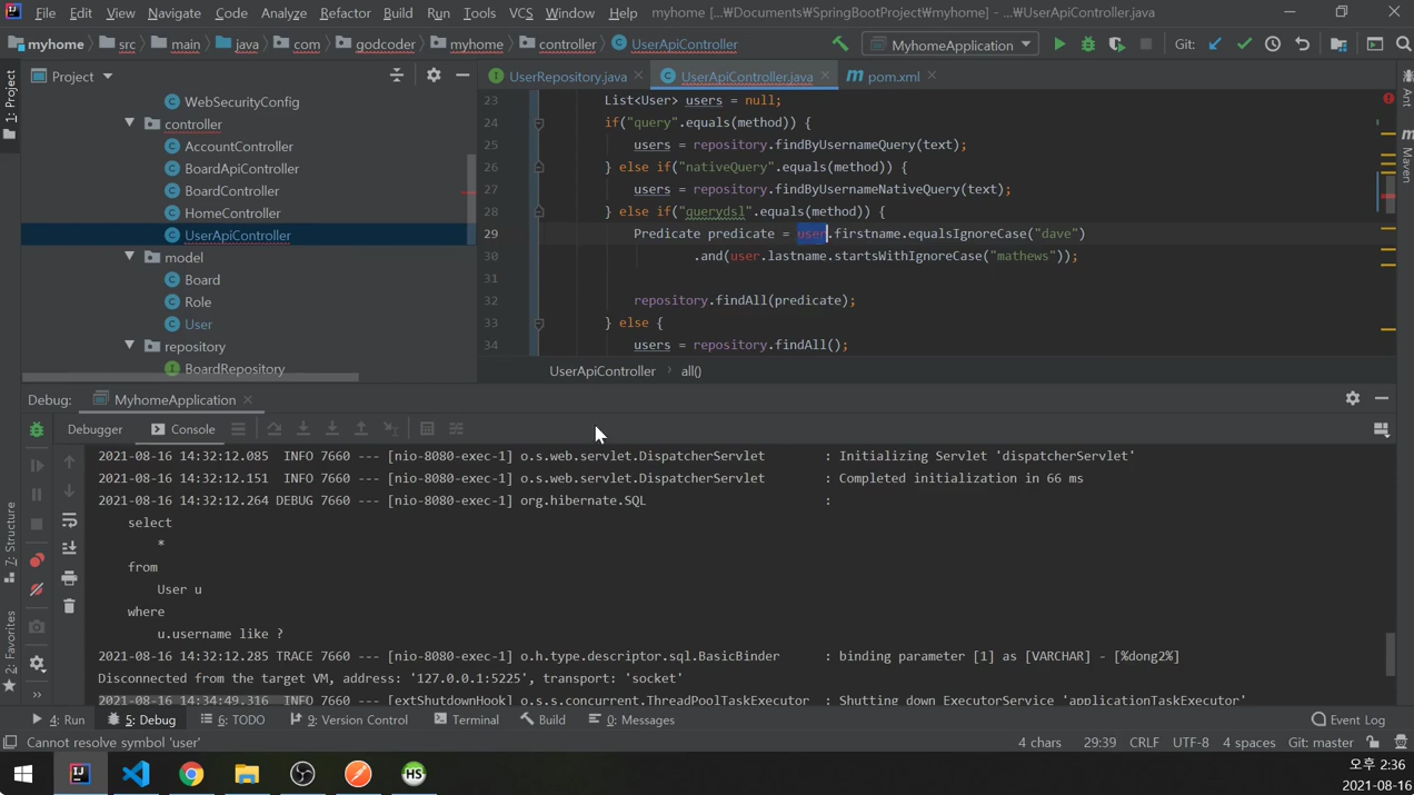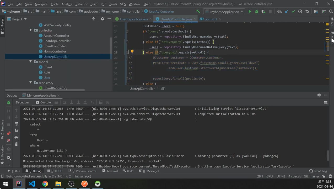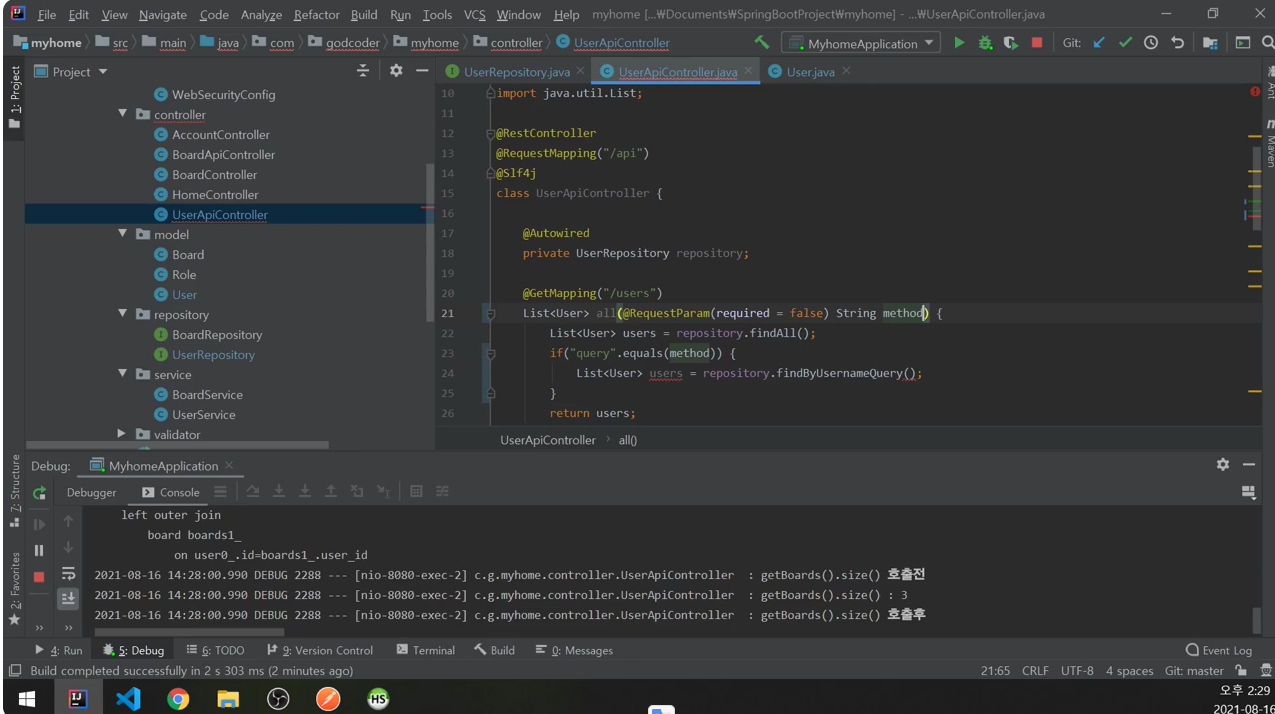 UserApiController에서는 조건절만 이용해서 findAll에 넘겼었다.