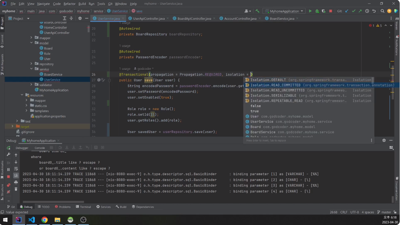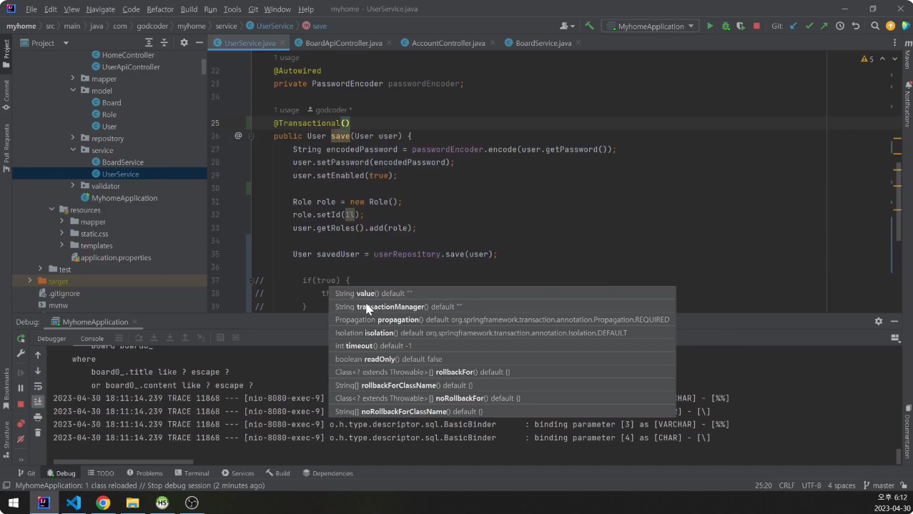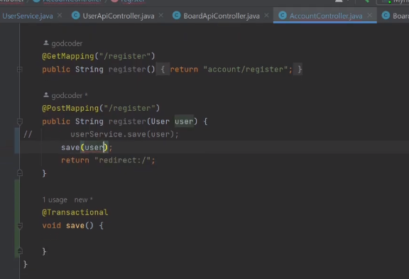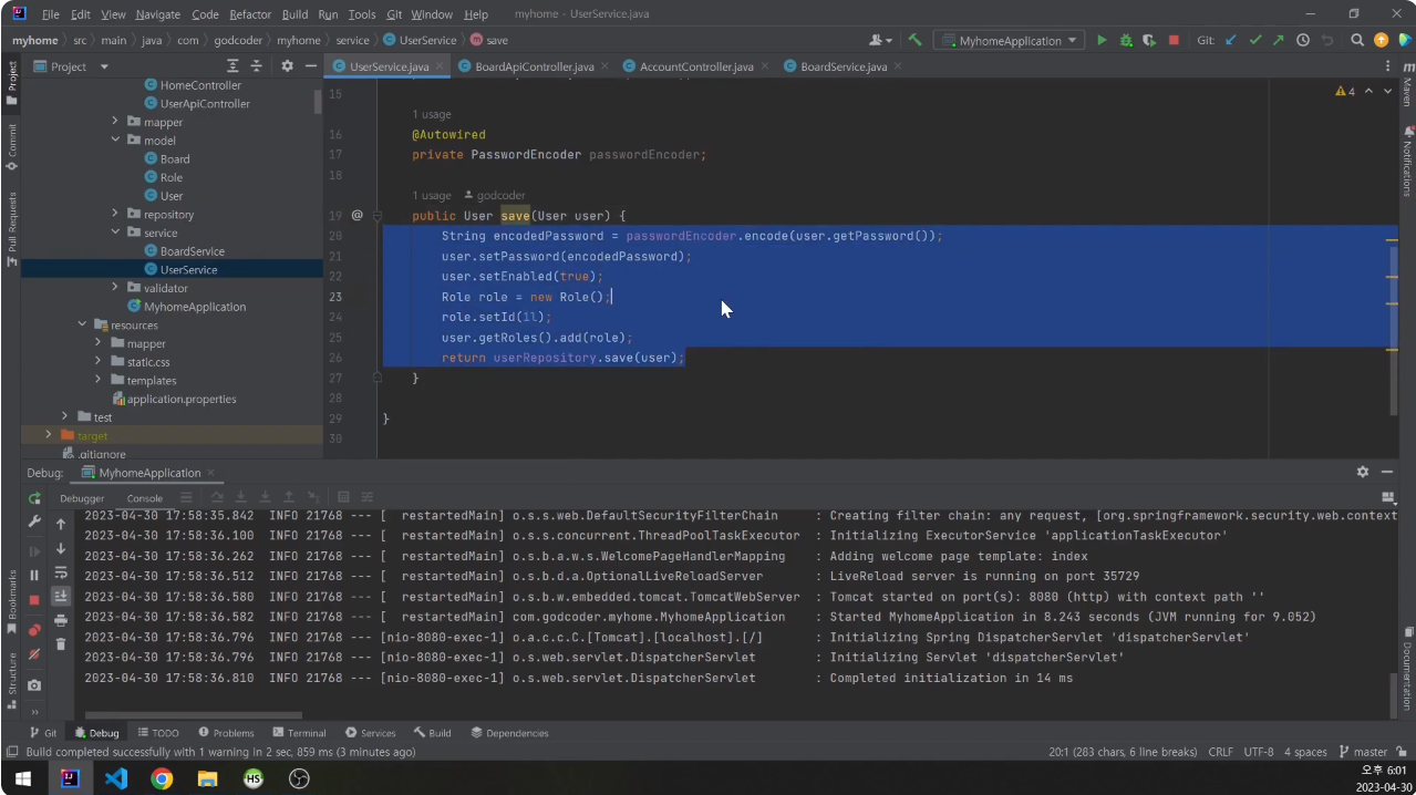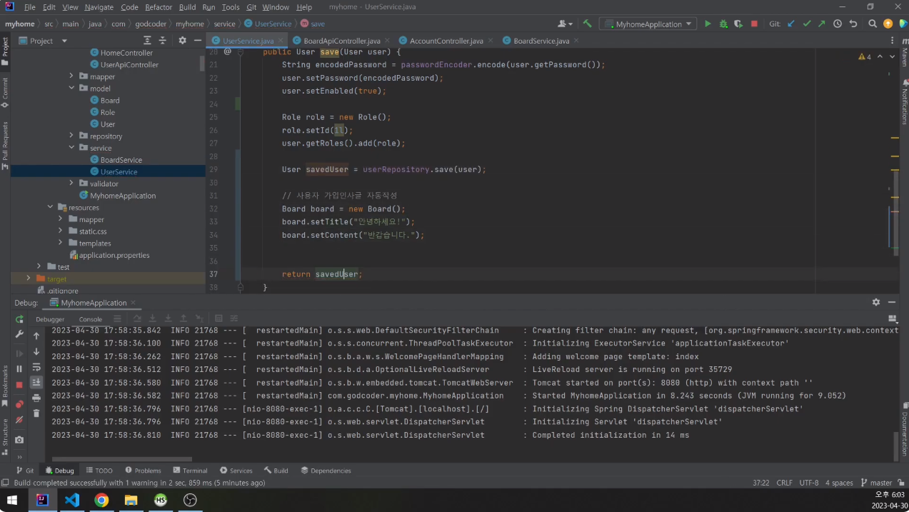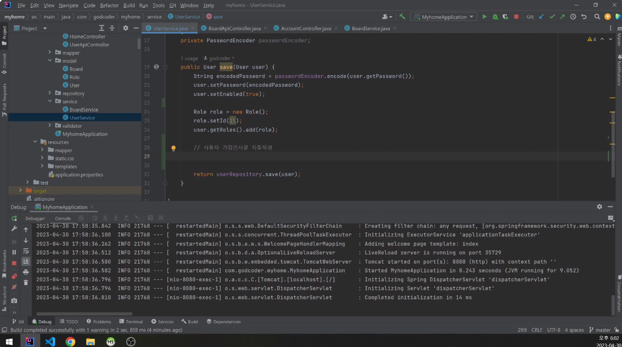세이브를 보면 사용자가 요청한 비밀번호 암호화해서 사용자 정보를 셋팅.