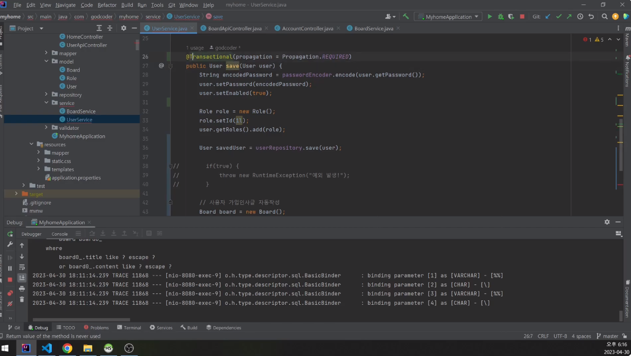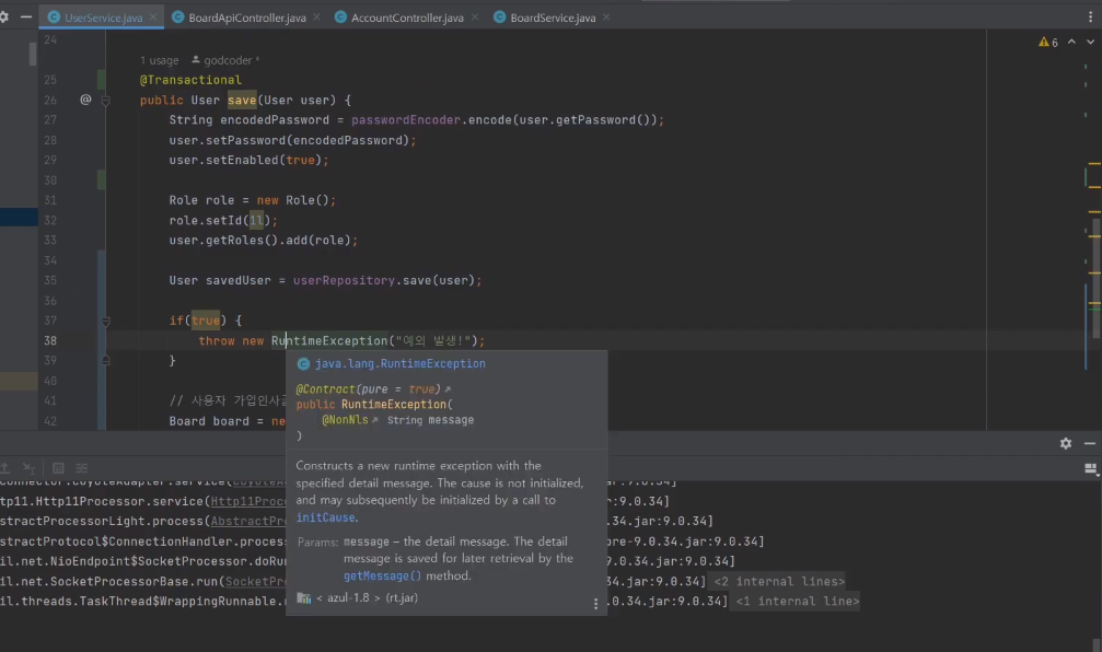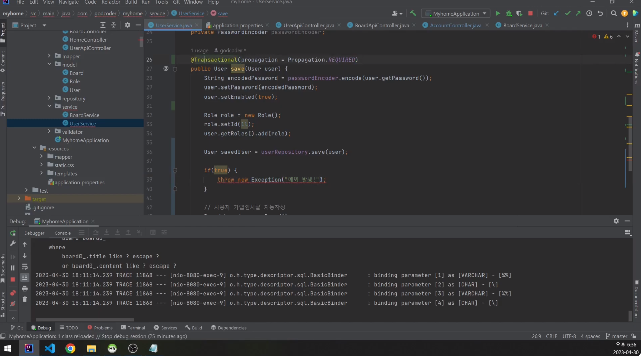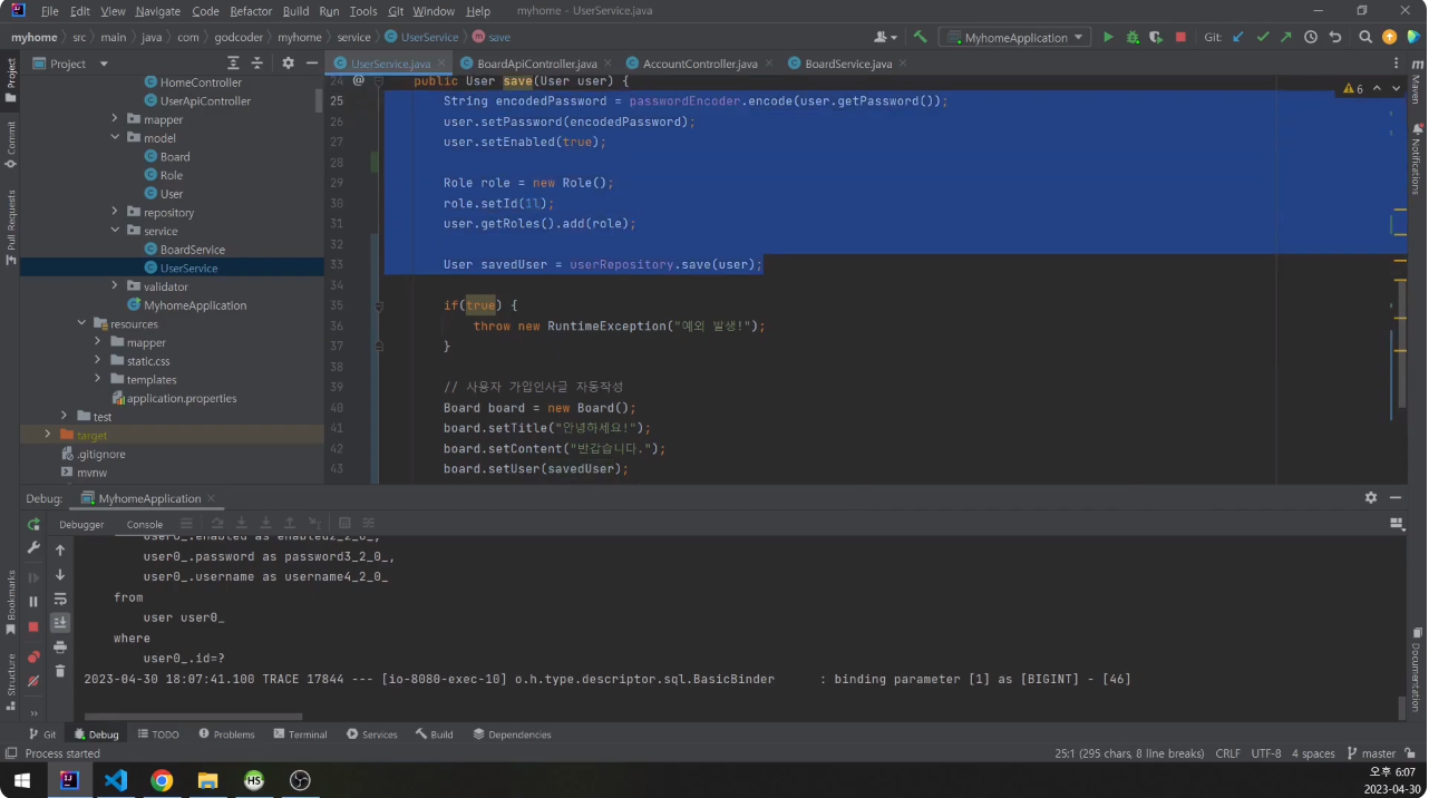 예외 표시를 지우고 회원가입을 하니 가입과 게시글 작성이 잘 됐음.