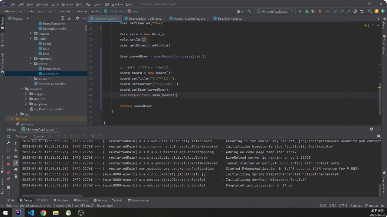 사용자 저장까지만 데이터베이스가 반영이 되었음.