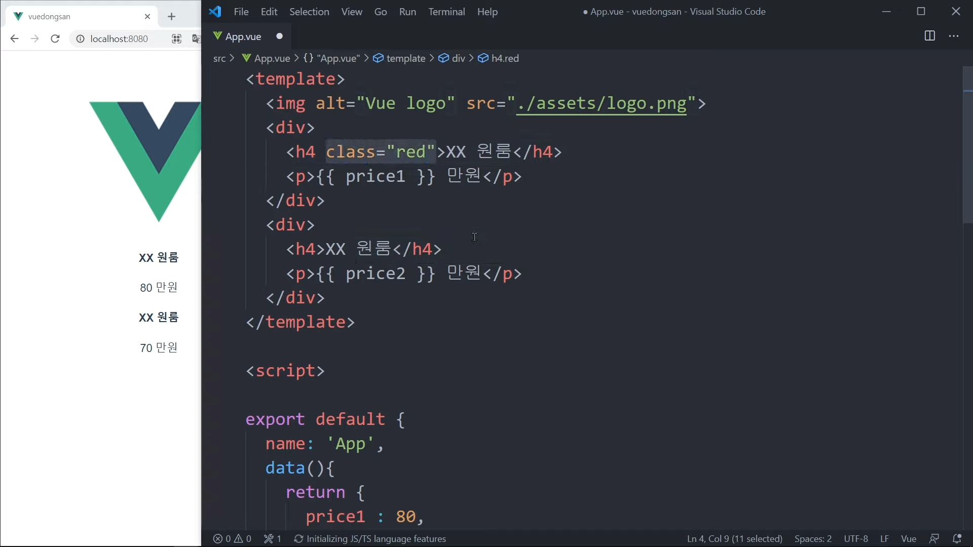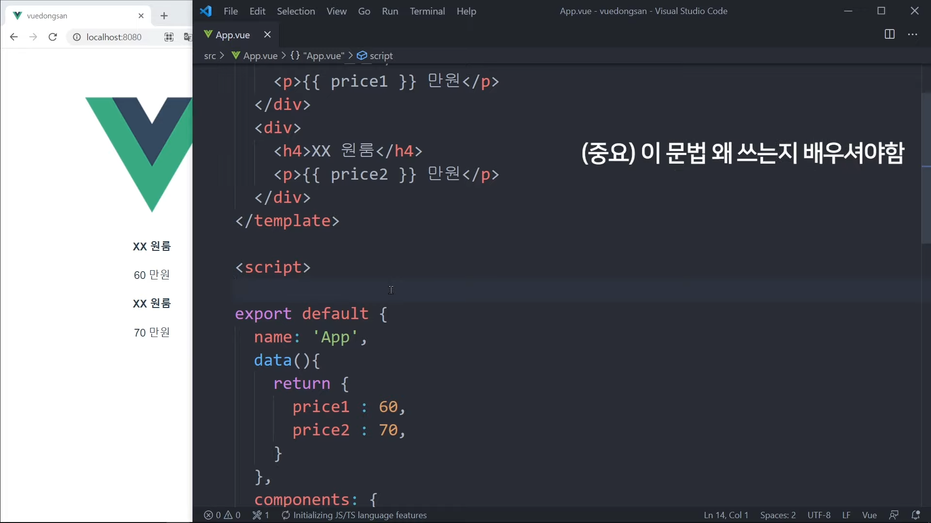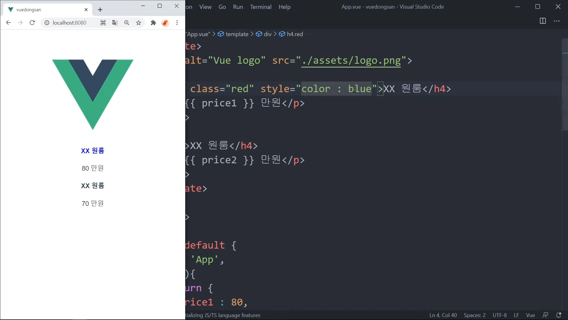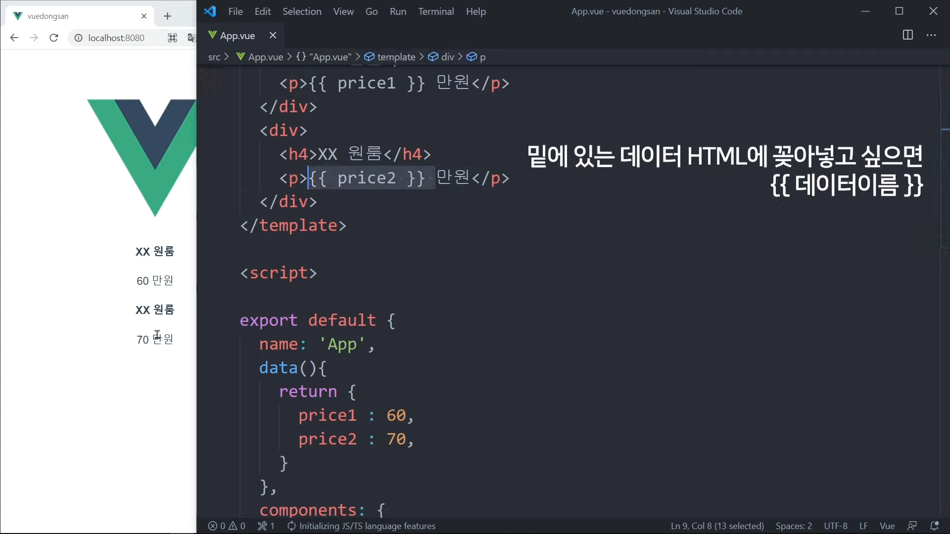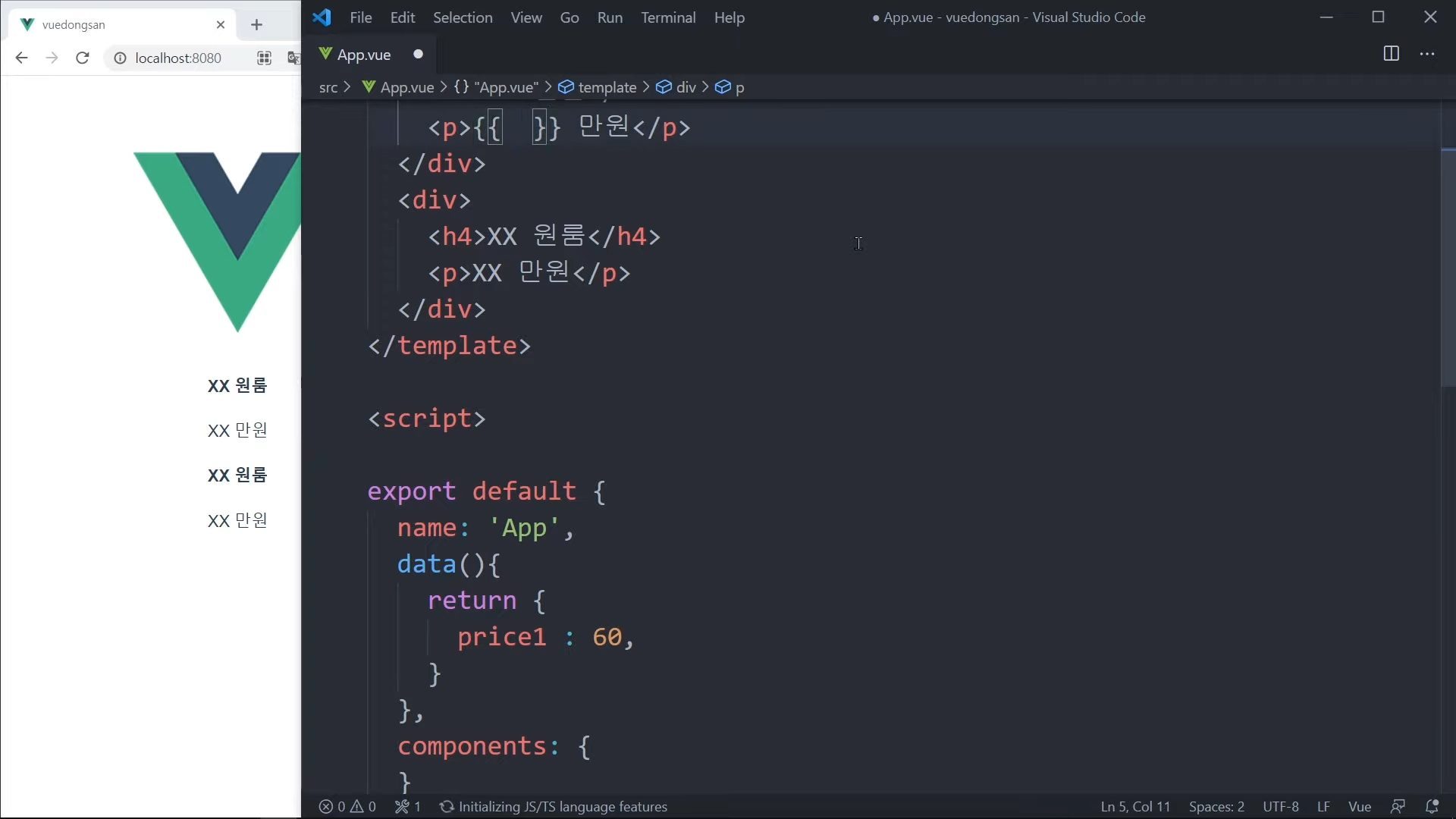 그냥 가격을 직접 적어도 되지만, Vue 문법으로 작성해볼 것임.