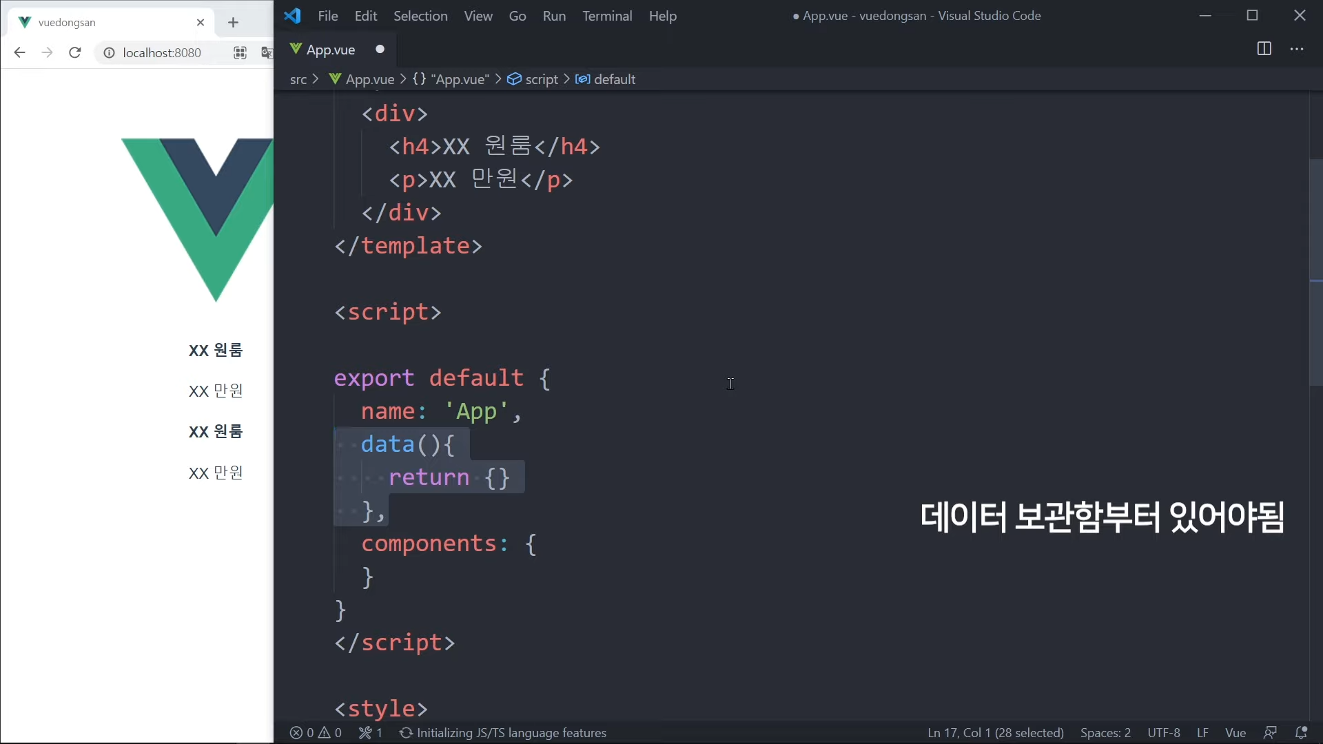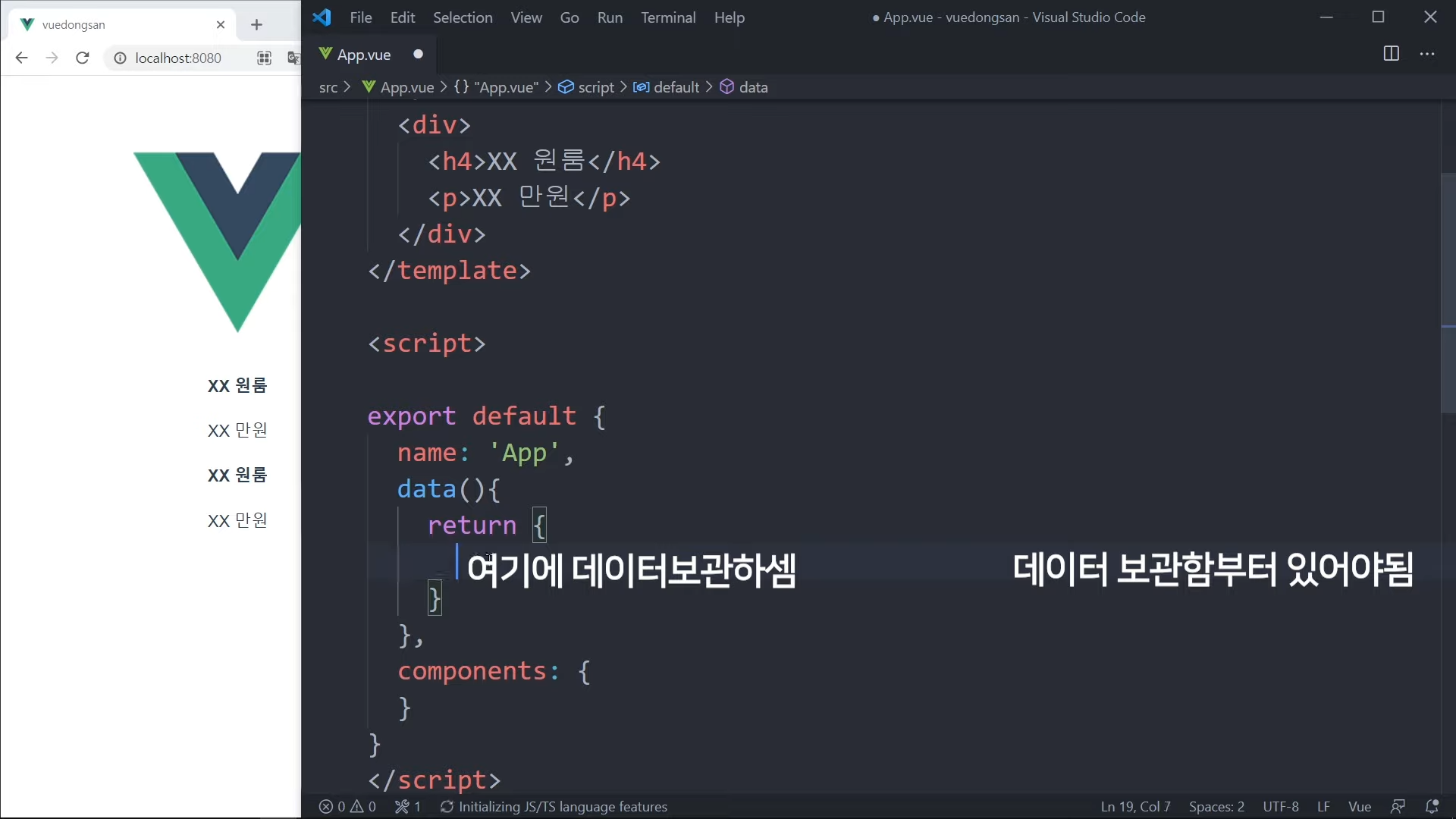 vue에서는 데이터를 꼽아 넣으려면 어딘가에 저장해야 한다.
