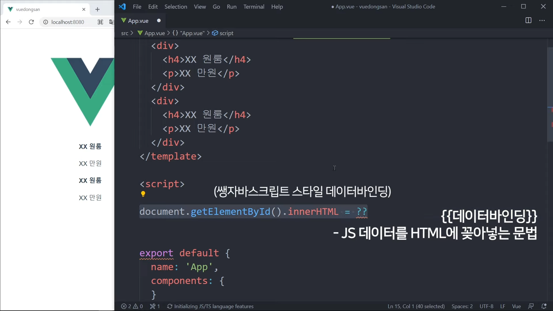 데이터바인딩은 예전에 생자바스크립트는 해당과 같이 작성했을 것이다.
