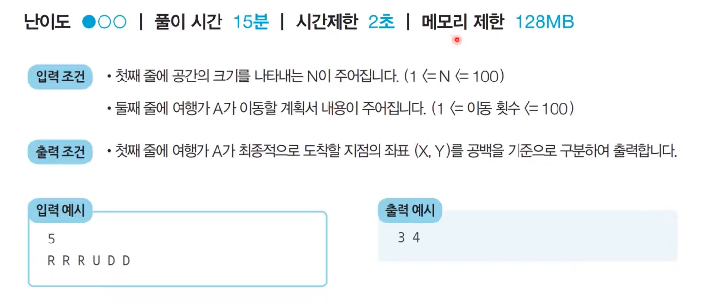 일련의 명령에 따라서 개체를 차례대로 이동시킨다는 점에서 시뮬레이션(Simulation) 유형으로도 분류되며 구현이 중요한 대표적인 문제 유형입니다.