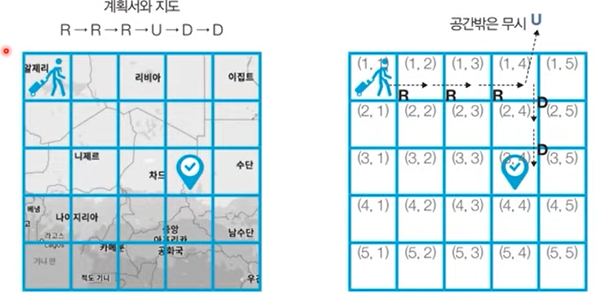 이때 여행가 A가 N × N 크기의 정사각형 공간을 벗어나는 움직임은 무시됩니다. 예를 들어 (1, 1)의 위치에서 L 혹은 U를 만나면 무시됩니다. 다음은 N = 5인 지도와 계획입니다.