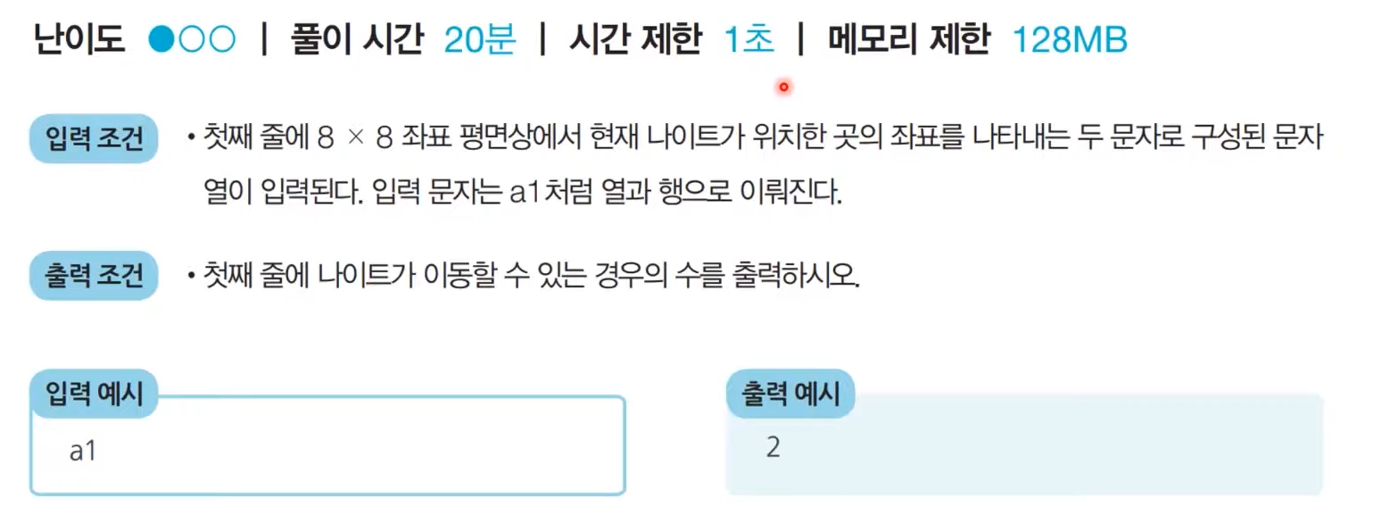 <문제> 왕실의 나이트: 답안 예시 (Python)