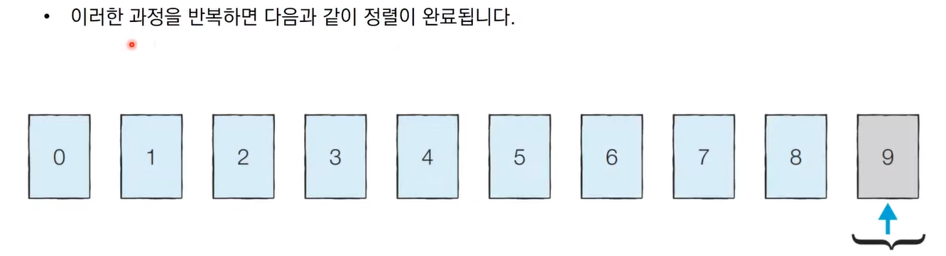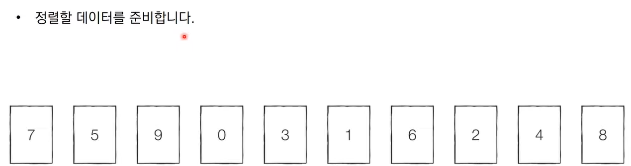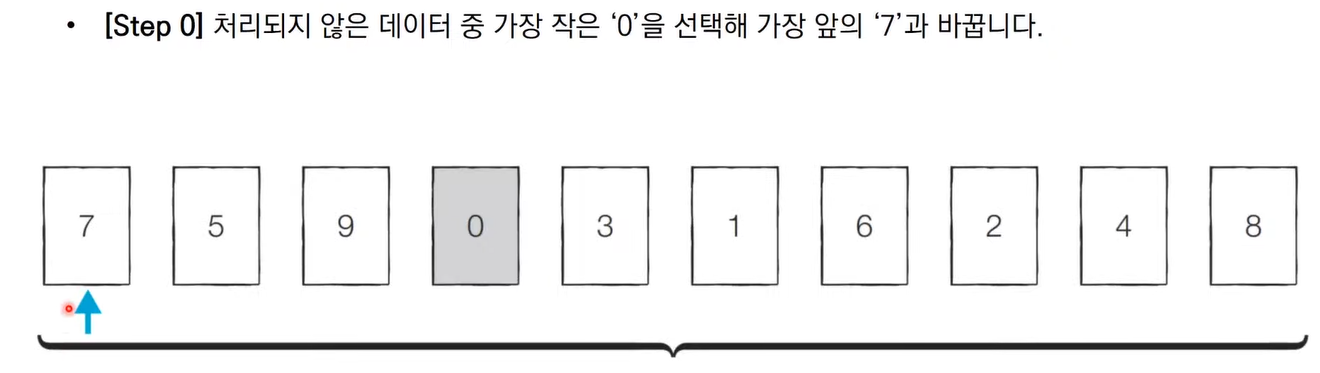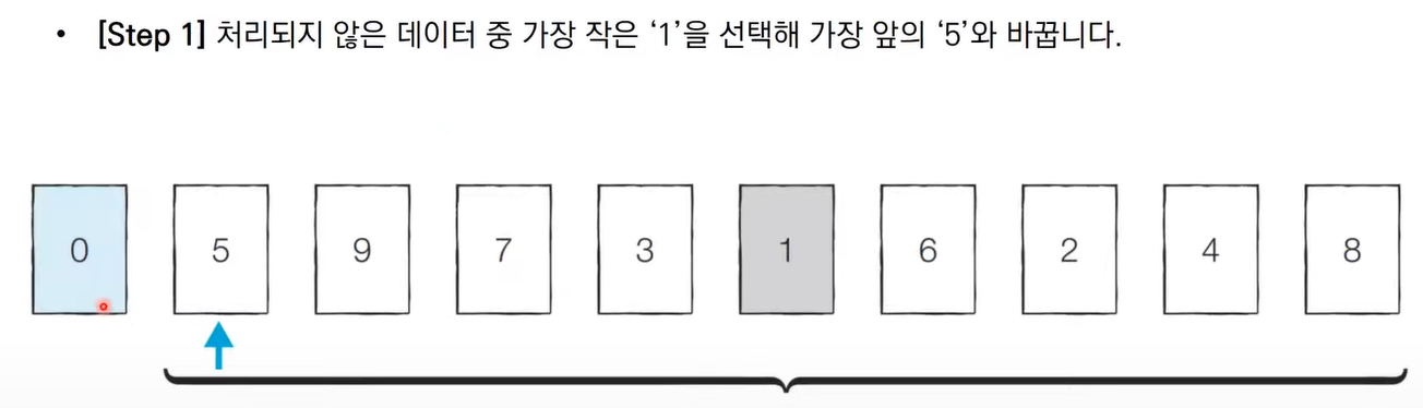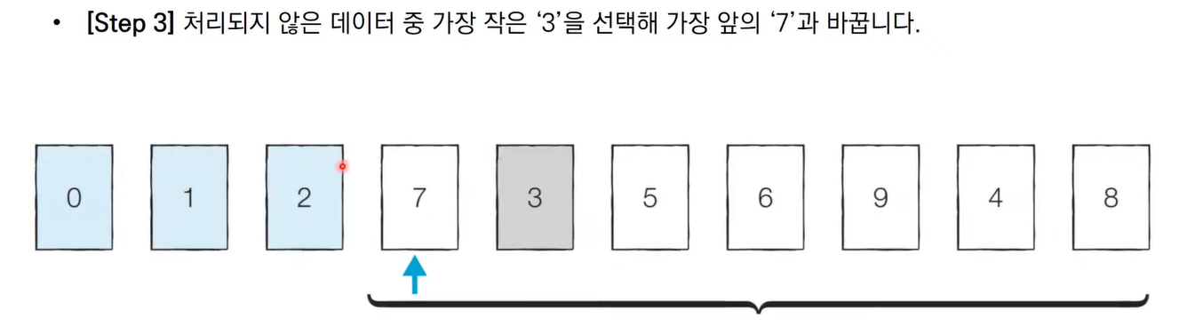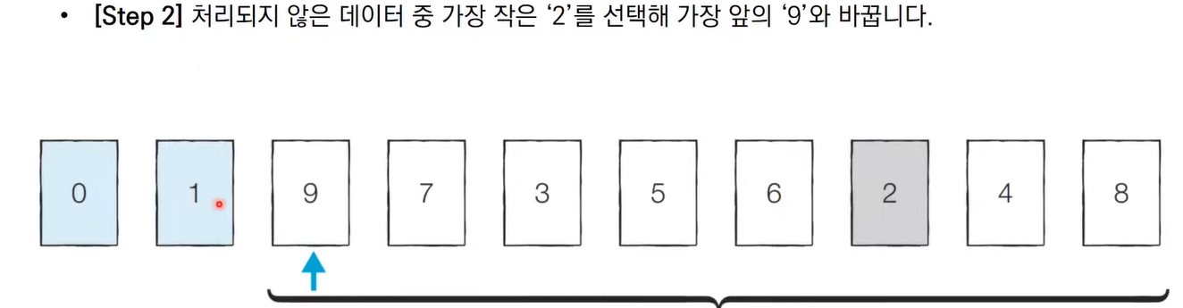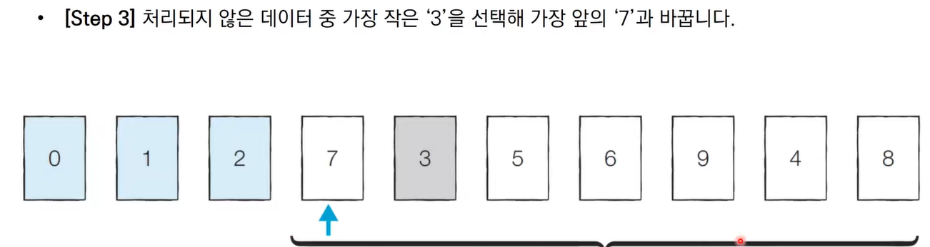 처리되지 않은 데이터 중에서 가장 작은 데이터를 선택해 맨 앞에 있는 데이터와 바꾸는 것을 반복합니다.