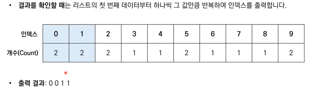 for i in range(len(count)): # 리스트에 기록된 정렬 정보 확인