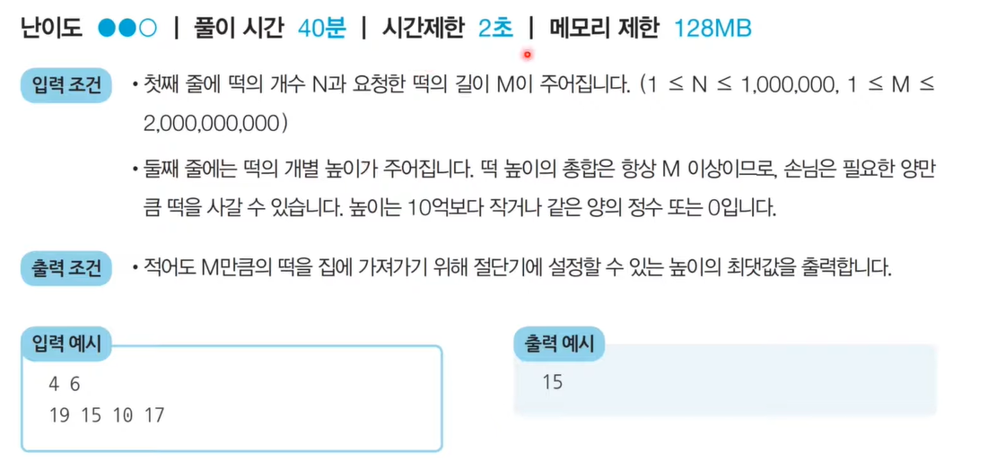 손님이 왔을 때 요청한 총 길이가 M일 때 적어도 M만큼의 떡을 얻기 위해 절단기에 설정할 수 있는 높이의 최댓값을 구하는 프로그램을 작성하세요..