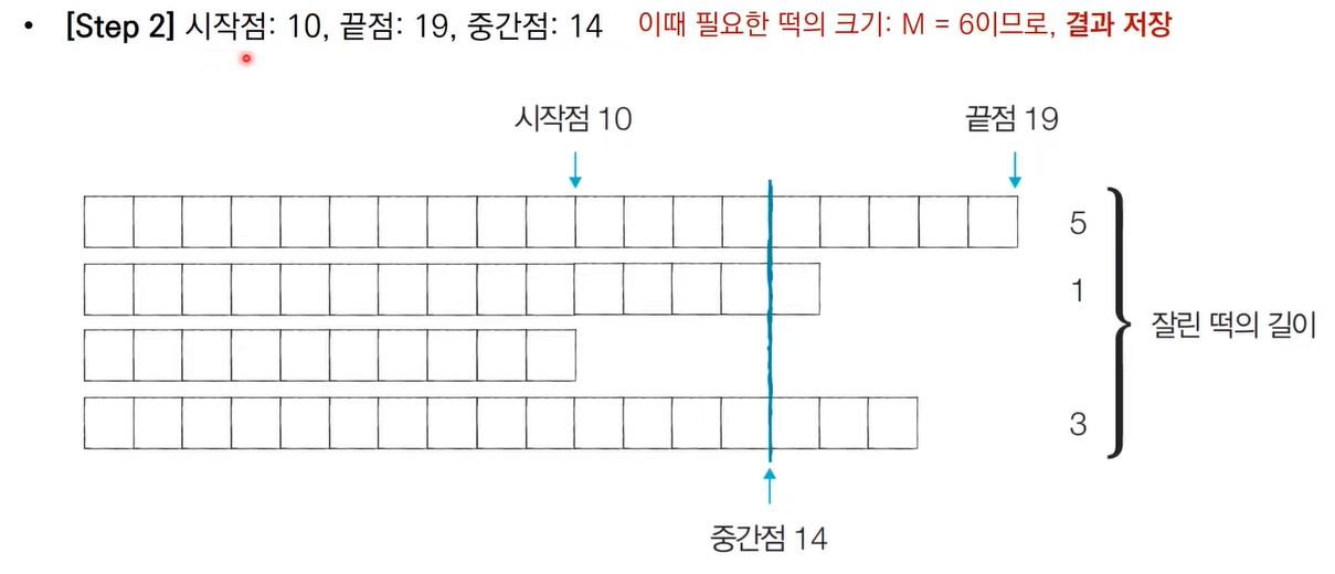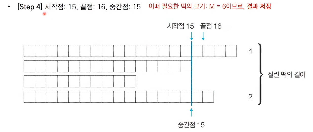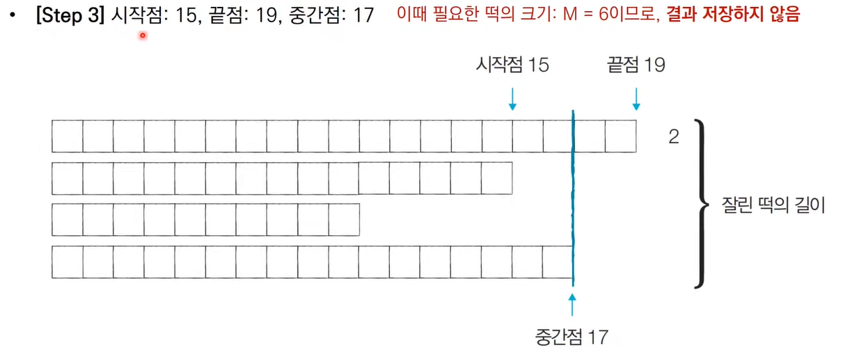 중간점의 값은 시간이 지날수록 '최적화된 값'이 되기 때문에, 과정을 반복하면서 얻을 수 있는 떡의 길이합이 필요한 떡의 길이보다 크거나 같을 때마다 중간점의 값을 기록하면 됩니다.