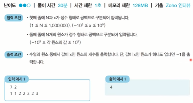 N개의 원소를 포함하고 있는 수열이 오름차순으로 정렬되어 있습니다. 이때 이 수열에서 x가 등장하는 횟수를 계산하세요. 예를 들어 수열 {1,1,2,2,2,2,3}이 있을 때 x = 2라면, 현재 수열에서 값이 2인 원소가 4개이므로 4를 출력합니다.