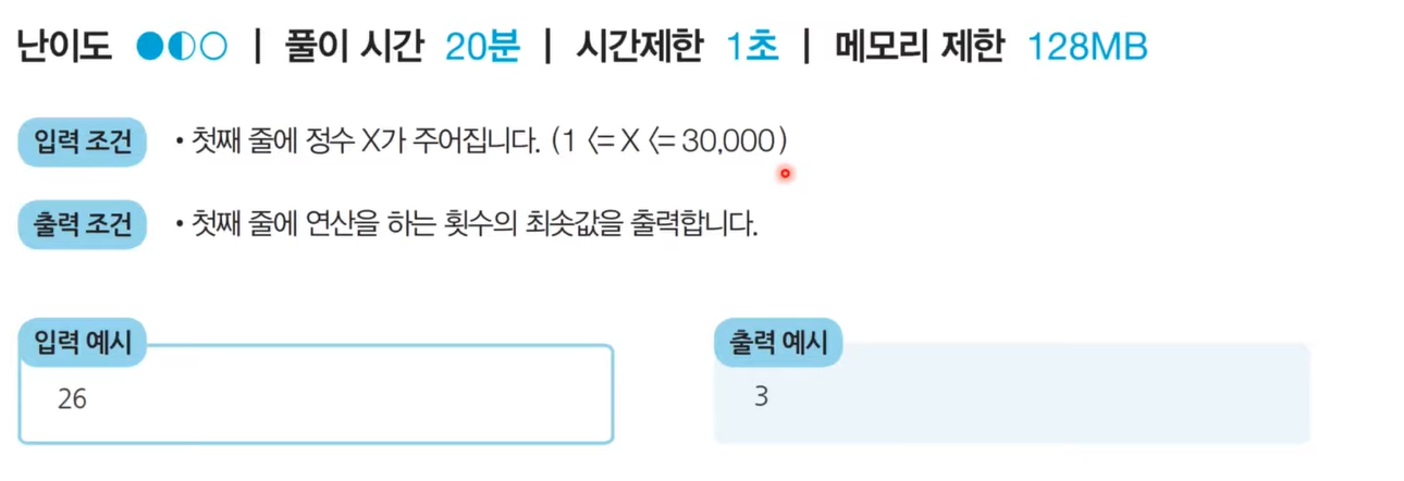 d[i] = min(d[i], d[i // 2] + 1) # 1을 더하는 이유 : d는 계산 횟수이기 때문, d[i]에 더하지 않는 이유는 위에서 1을 뺄 때 더해줬기 때문