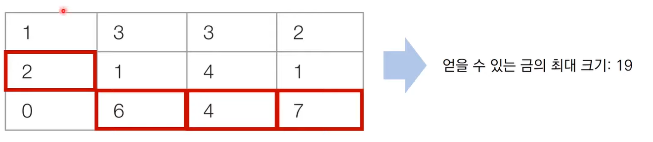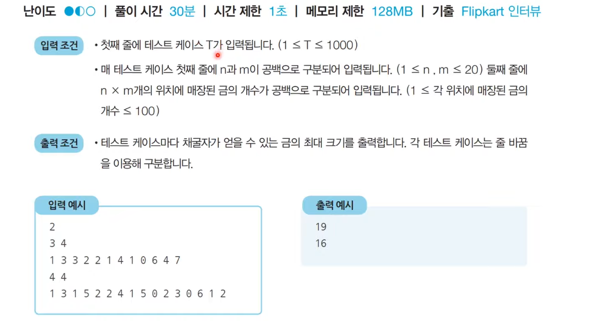 n x m 크기의 금광이 있습니다. 금광은 1 x 1 크기의 칸으로 나누어져 있으며, 각 칸은 특정한 크기의 금이 들어 있습니다.
