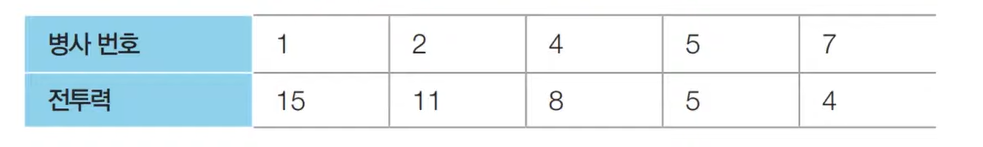 이때 3번 병사와 6번 병사를 열외시키면, 다음과 같이 남아 있는 병사의 수가 내림차순의 형태가 되며 5명이 됩니다. 이는 남아 있는 병사의 수가 최대가 되도록 하는 방법입니다.