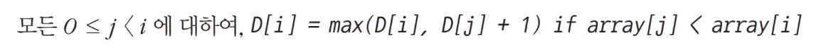 𝐷[𝑖]= 𝒂𝒓𝒓𝒂𝒚[𝑖]를 마지막 원소로 가지는 부분 수열의 최대 길이