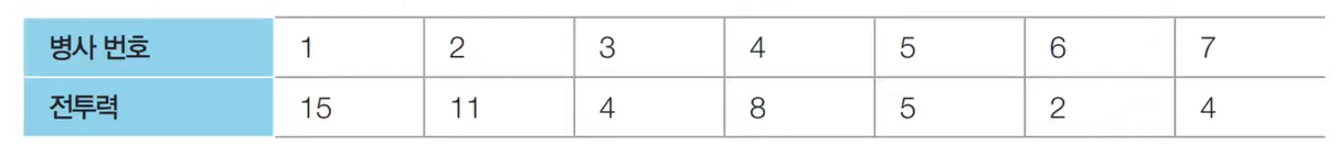 예를 들어, N = 7일 때 나열된 병사들의 전투력이 다음과 같다고 가정하겠습니다.