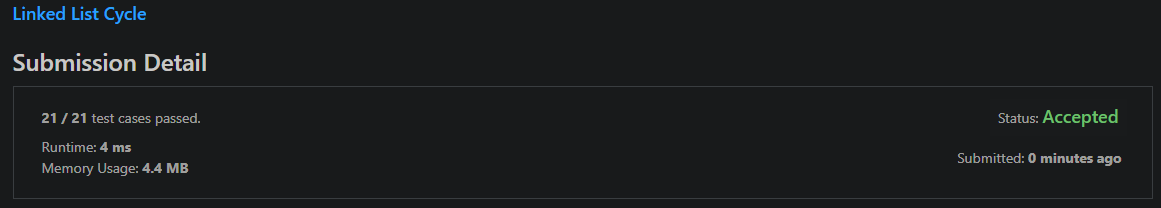 There is a cycle in a linked list if there is some node in the list that can be reached again by continuously following the next pointer. Internally, pos is used to denote the index of the node that tail's next pointer is connected to. Note that pos is not passed as a parameter.