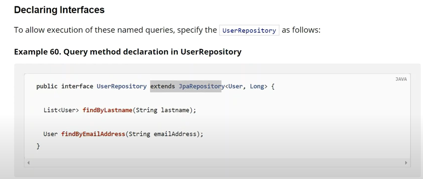 JPA 레파지토리를 상속 받아서 그 안에서 메소스 이름 등.