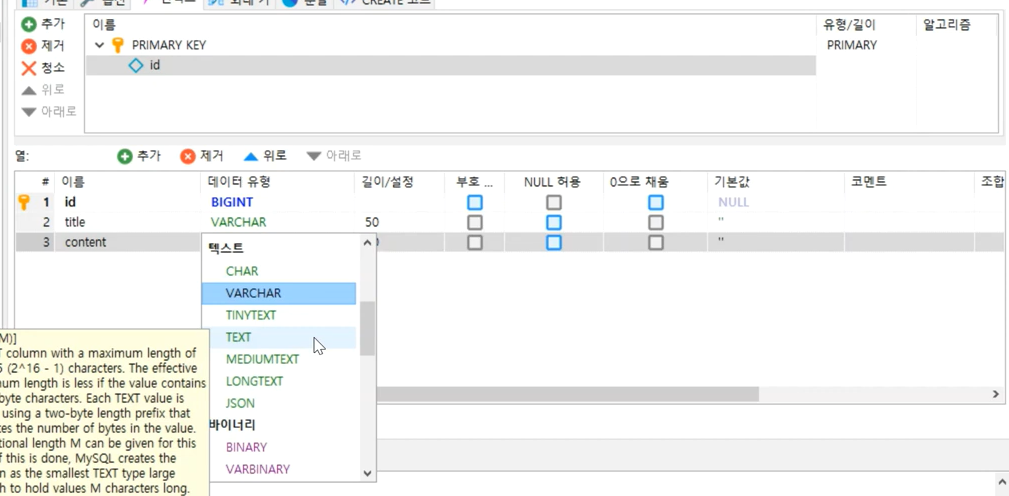게시글 내용은 text로 지정