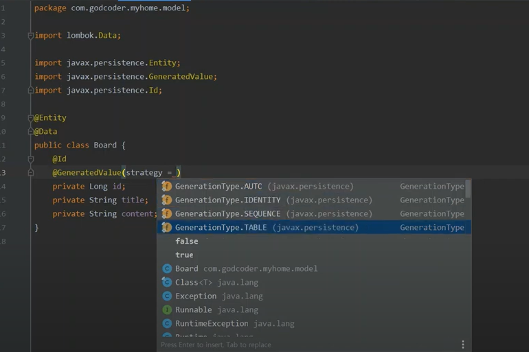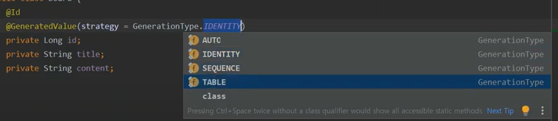 데이터베이스에 따라서 설정이 됨. 가장 성능이 좋은건 SEQUENCE이다. 배치 업데이트 할 때 시퀀스를 미리 받음. 가장 빠름. 그러나 관리하기 힘듦. 일반적으로는 Identity.