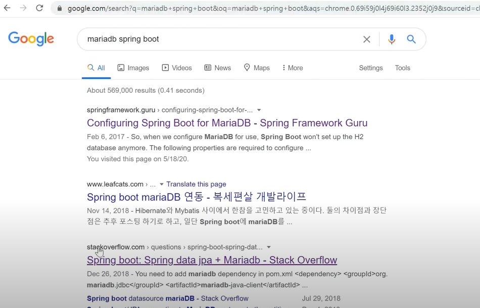 mariadb springboot을 검색해보면 데이터 소스 설정을 해야 한다.