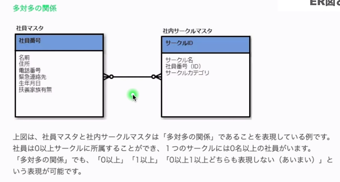 사원테이블과 써클 테이블이 있다. 써클은 만들었지만, 누구도 참가하지 않는 경우는 0가 될 수 있으므로 0 이상이므로 세로표가 아닌 0의 표를 넣는다. 기억해주길 원하는 것은 0이 있을지 없을지는 설계에서 중요하지 않다.