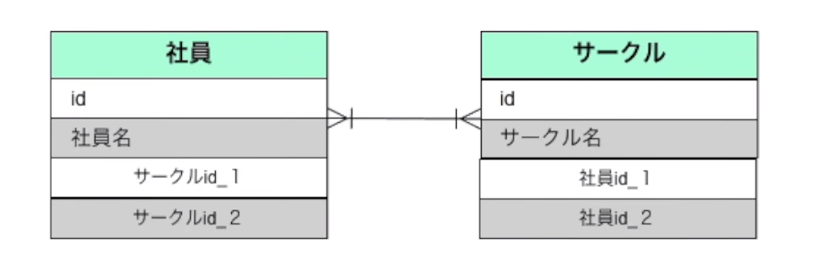서클에 2개밖에 소속이 안되고, 서클에서도 2명의 사원밖에 포함못시킨다. 확장성이 나쁘다. 좋지 않은 설계가 된다. 서클 활동을 하지 않는 사원은 서클에서도 사용하지 않으므로 쓸모없는 컬럼이 된다. 그러한 면에서 좋지 않다.