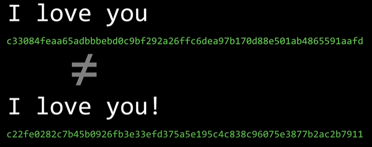 - '해시(hash)에 대해서 이야기해보자. 이건 수학 함수인데, 한 개의 인풋을 받으면 아웃풋을 준다. 포인트는 이건 '일방향 함수' 이고 '결정론적'이다. '결정론적'이란 인풋 '사랑해'의 아웃풋은 항상 같은 것으로 정해져 있다. '사랑해' -> 항상 정해져있는 아웃풋. 만약 내가 인풋 '사랑해'를 살짝 바꿔서 '사랑해!'로 하면 그 경우 아웃풋은 엄청나게 바뀐다. 바로 이게 '결정론적'이라는 것이다.