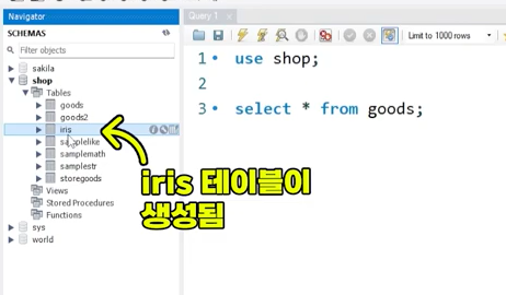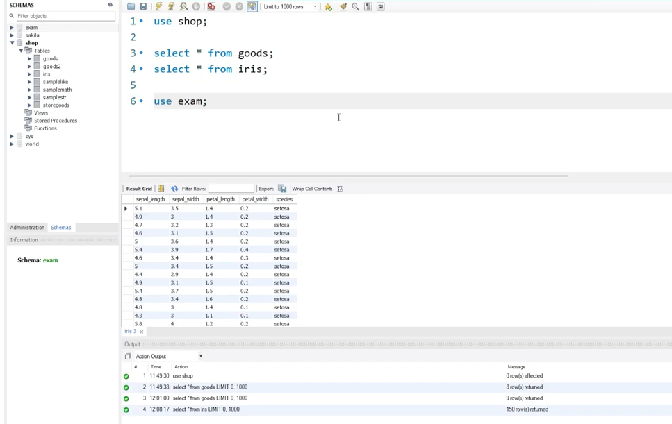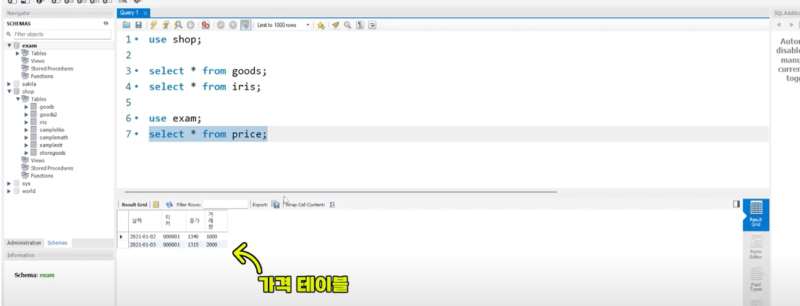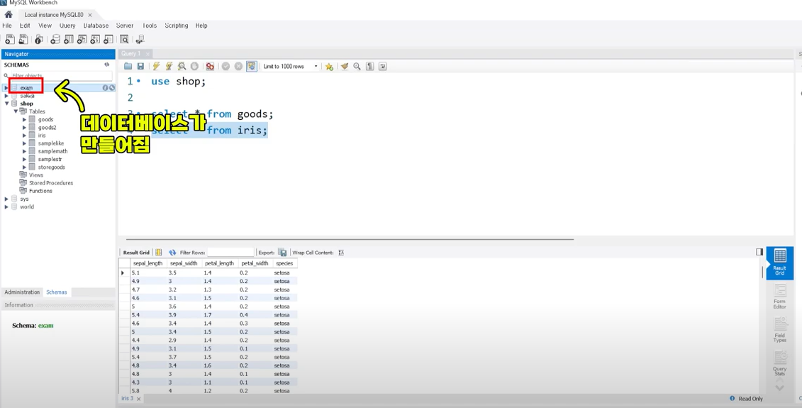 exam이라는 데이터베이스를 작성함.